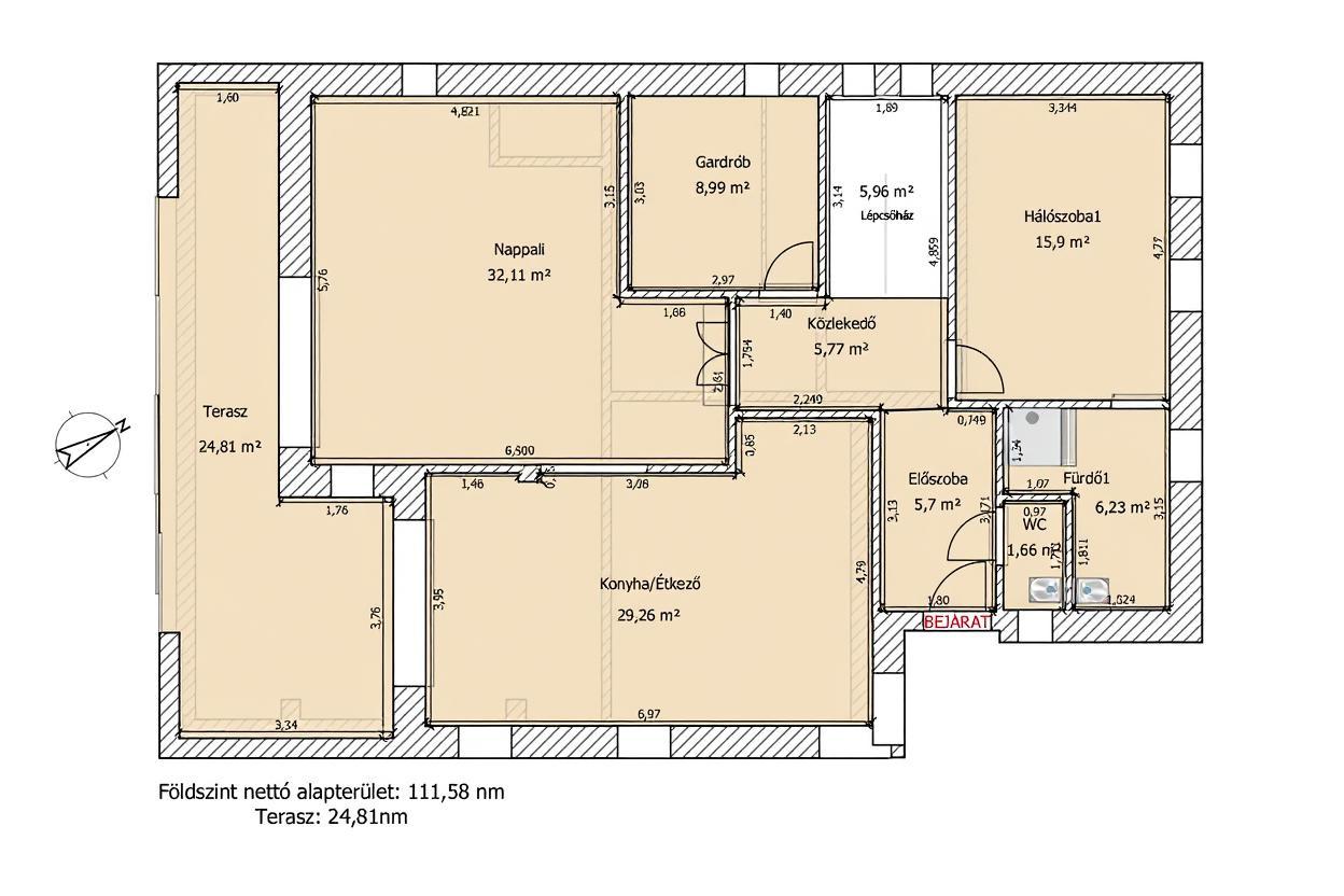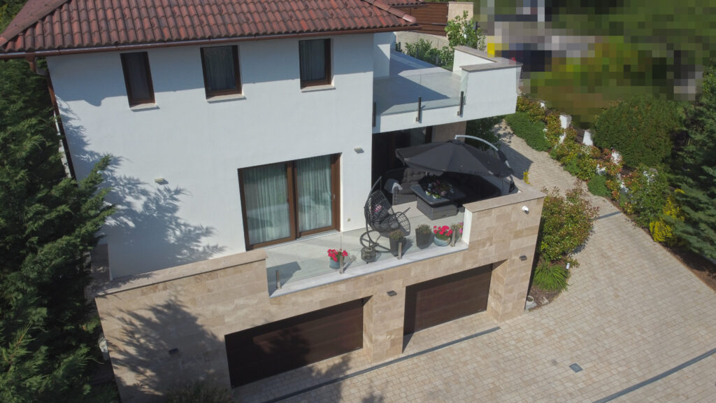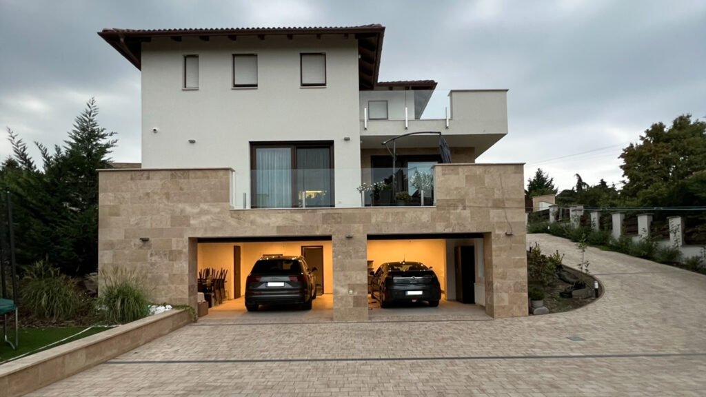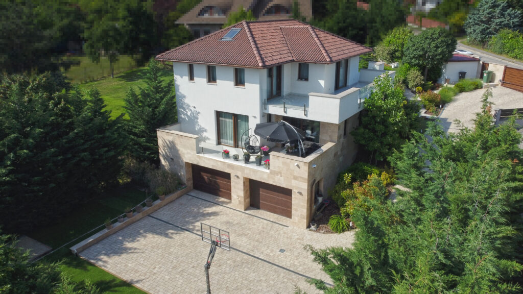 Az ingatlan háromszintes, összesen 291 m² hasznos alapterülettel, melyből a pince- és garázsszint 101 m², a földszint 111 m², míg az emelet 78 m². A földszinten egy 24 m²-es, az emeleten pedig egy 51 m²-es egybefüggő, üvegkorlátos terasz található. A 2022-ben kialakított belső tér elosztása nappalit, négy hálószobát, egy gardróbot, külön konyhát és étkezőt tartalmaz, továbbá két fürdőszoba és két külön WC/mosdó is rendelkezésre áll. Az épület kiváló hőszigetelését 38 cm vastag Porotherm tégla külső falazat és 20 cm-es grafitos szigetelés biztosítja, míg a megjelenést prémium minőségű sütői mészkő homlokzati burkolat teszi teljessé, mely szintén 2022-ben került felújításra.