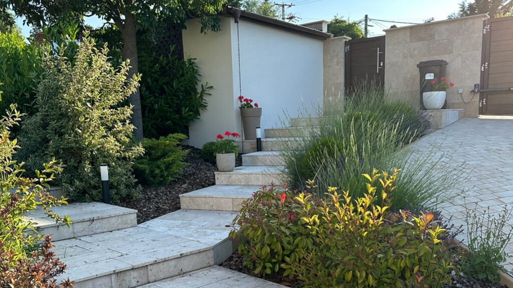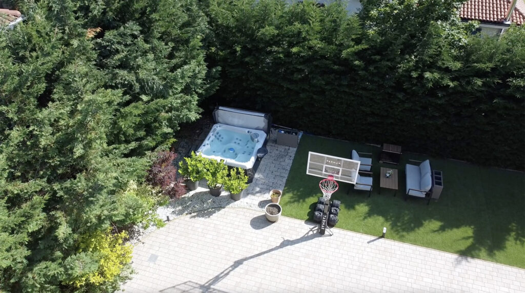 Öntözőrendszerrel ellátott 889 m²-es telek, ami igény szerint kibővíthető 1199 m²-re. Örökzöldekkel parkosított intim kert, holland pázsit, mészkő járólapok, 5 személyes Wellis jacuzzi biztosítja a felfrissülő pihenést.