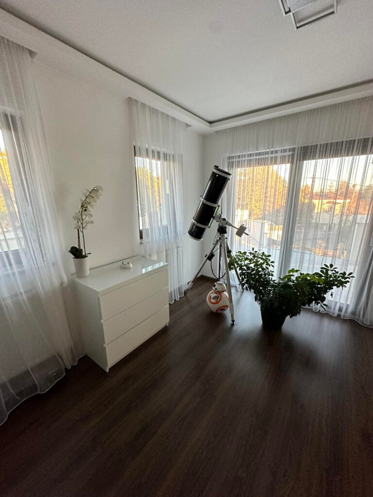 A prémium életérzést a 76 m²-es, üvegkorlátos körpanorámás terasz, jakuzzi, padlófűtés, 5 inverteres klímaberendezés, elektromos redőnyök, fűtött gépkocsi-beálló, valamint a kétállásos garázs biztosítja. A biztonságról riasztó- és 360 fokos kamerarendszer gondoskodik.